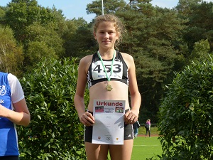 Karla schaffte es, die bis dahin Führende mit 7,35 m von Platz 1 zu "stoßen" und freute sich anschließend bei der Siegerehrung über eine Goldmedaille.
