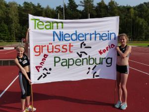 21.09.2014 Schülersportfest in Papenburg Nach dem Motto: "Hinter dem Horizont geht's weiter" ...... machten sich 2 unserer Athleten auf nach Papenburg (Niedersachsen). Anna-Lena Berninger (W10) startete gleich 2 Altersgruppen höher und behauptete sich, zusammen mit Karla Dohmen (W12) vom Team Niederrhein, gegen die Konkurrenz aus anderen Bundesländern sehr gut. Den Weitsprung nutzten beide Sportlerinnen zum Warm werden, um im 75 m-Lauf auf Touren zu kommen. Mit 11,07 sec. belegte Karla den dritten Platz und mit einer neuen Bestleistung von 11,21 sec. sprintete Anna-Lena auf Platz fünf. Beim Kugelstoßen blieb es bis zum letzten Versuch spannend. Karla schaffte es, die bis dahin Führende mit 7,35 m von Platz 1 zu "stoßen" und freute sich anschließend bei der Siegerehrung über eine Goldmedaille.Den Abschluss dieser gelungenen Veranstaltung in Papenburg bildete der 800 Meter-Lauf. Beide Athletinnen liefen von Anfang an ein beherztes Rennen und ließen den Abstand zu den Führenden nicht allzu groß werden. Auf den letzten 200 Metern versuchten sie durch einen tollen Spurt den Abstand noch zu verringern und landeten auf den Plätzen drei und vier in der AK W12. Ganz nebenbei lief Anna als Vierte mit 2:54,31 min. eine neue Bestzeit. Hier alle Ergebnisse aus Papenburg: www.lg-papenburg-aschendorf.de/attachments/article/634/Ergebnisse.pdf