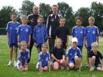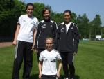 06.06.2009 DSMM B-Schülerinnen in Leverkusen Bei einem Mannschaftswettbewerb (DSMM = Deutsche Schüler Mannschaft Meisterschaft) in Leverkusen erkämpfte sich das durch 4 Ausfälle gebeutelte TEAM Niederrhein einen feinen 3. Platz mit 6429 Punkten hinter den Mannschaften aus Wuppertal 6808 Pkt. und Bayer Leverkusen mit 6668 Pkt. In dem DSMM Wettbewerb der Gruppe 1 der Schülerinnen B (W12 und W13) werden 7 Wettbewerbe mit je 2 Aktiven gewertet, wobei jede Aktive aber nur 3 Wettbewerbe bestreiten darf. Erst sehr kurzfristig vor der Anreise nach Leverkusen hatten sich 4 Mädchen krank gemeldet und fielen somit aus. "Das hat uns in der Endabrechnung knapp 300 Punkte gekostet und trotz tollem Einsatz aller Starterinnen, war das nicht mehr auszugleichen", bilanzierte Trainer Hannes Hücklekemkes nach der Veranstaltung. In Leverkusen war es kalt und es regnete den ganzen Tag. Überragende Leistungen schafften: Lynn Lottes (W13) sprang im Hochsprung motiviert durch die prominente Kampfrichterin mit 1,44m eine neue Bestleistung. Die 2-fache Olympiasiegerin (Ulrike Meyfarth) im Hochsprung mit einer Bestleistung von 2,02m betätigte sich als Kampfrichterin und lobte Lynn Lottes für ihren tollen Wettkampf. Caroline Kuhlmann (W12) überraschte dann beim Weitsprung, als sie sich von 4,68m auf die tolle Weite von 4,90m steigerte. Und im abschließenden Wettbewerb über 800m lief sie ein klug eingeteiltes Rennen, übernahm nach 400 m die Führung und siegte überlegen mit der neuen Bestzeit von 2:36,49min. Charlyn Meyer (W13) lief im 75m Sprint mit 10,91sek. eine neue Bestleistung und steuerte wichtige Punkte zum Mannschaftsergebnis bei. Alle Leistungen des TEAM Niederrhein in der Übersicht: 60m Hürden Lynn Cherubin 10,96sek. Lynn Lottes 11,08sek. Leonie Freynhofer 11,32sek. Hochsprung Lynn Lottes 1,44m Caroline Kuhlmann 1,36m Leonie Freynhofer 1,28m 75m Charlyn Meyer 10,91sek. Larissa Manca 11,23sek. Clara Gottstein 11,67sek. Weitsprung Caroline Kuhlmann 4,90m Lynn Lottes 4,58m Charlyn Meyer 4,33m Ballwurf Lynn Cherubin 38,50m Larissa Manca 37,00m Clara Gottstein 27,50m Bianca Ludwig 26,50m 4x75m C. Gottstein - Leonie Freynhofer - Charlyn Meyer - Larissa Manca 44,42sek. 800m Caroline Kuhlmann 2:36,49min. Rebecca Pfau 2:46,79min.
